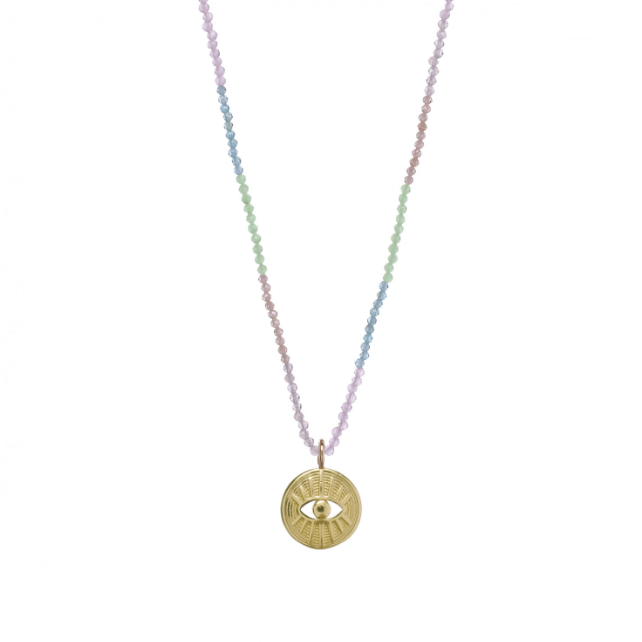 Collar de plata bañada en oro con diseño de bolas de colores y medalla con ojo.